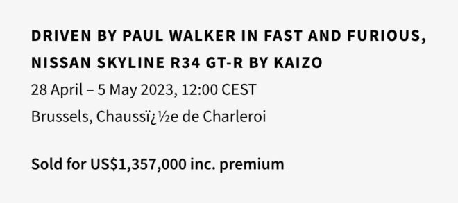 Paul Walker tarafından kullanılan Nissan Skyline GT-R R34 rekor fiyata satıldı. Araç bu konuda büyük bir rekor kırmış gibi görünüyor.