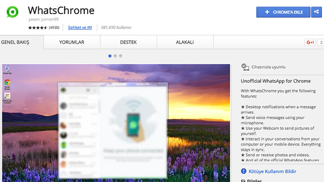 WhatsChrome adını taşıyan eklenti, PC’de WhatsApp kullanımını daha kolay hale getiriyor. Bildiğiniz gibi, WhatsApp’ın halihazırda PC’ler için yayınladığı kendi web uygulaması mevcut. Aynı mantıkla çalışan ve aynı imkanları sunan WhatsChrome eklentisi de Chrome kullanıcıları için işleri daha basit ve pratik hale getiriyor. Masaüstü bildirimleri, bilgisayarın mikrofonunu kullanarak sesli mesaj gönderme, bilgisayarın kamerasıyla fotoğraf çekme ve diğer tüm WhatsApp özellikleri WhatsChrome’da mevcut. WhatsChrome eklentisini Chrome tarayıcınıza buradan ekleyebilirsiniz. Eklentinin resmi olmadığını tekrar hatırlatmakla fayda var.