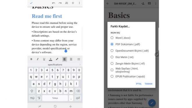 Mobilde ise Drive ve Google Dokümanlar uygulamalarını ayrı ayrı indirmeniz gerekiyor. Drive içinde halihazırda yüklü PDF dosyanız yoksa sağ altta yer alan artı (+) simgesine tıklayarak dosya yükleyebilirsiniz. Drive’da mevcut bir dosyanız varsa direkt Google Dokümanlar uygulamasına girip oradan dosyayı seçmeniz gerekiyor. Dosyanın sağ alt tarafındaki kalem simgesine tıklayarak düzenleme yapabiliyorsunuz. Daha sonra Paylaş ve dışa aktar > Farklı kaydet kısmından belge formatını seçerek dışarı aktarabilirsiniz
