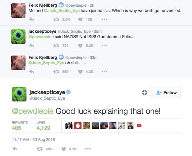 Bir örnek vermek gerekirse geçtiğimiz yıl ağustos ayında PewDiePie, Twitter’ından onaylanmış bir hesap olduğunu gösteren mavi tiki kaldırmasıyla bir anda olay oldu. Ancak olayın çıkış noktası bir parodi haber hesabıydı. PewDiePie’ın terör örgütüne katılma şüphesiyle hesabının onayı kaybettiğini söylüyordu. Bunun üzerinde bir şaka yapan PewDiePie bir başka YouTuber olan JackSepticeye’ı da işin içine katarak beraber bahsedilen örgüte katıldıklarına dair bir tweet attı. (Bu arada WSJ için bir not düşelim, bu tweet’e cevap olarak JackSepticeye Nazi’lere katılmaları yönünde bir şaka yapmıştı. Belki onu da araştırmak isteyebilirler.) Sonra ana akım medyadaki haberler ise PewDiePie’ın hesabının bu şaka yüzünden onayını kaybetmesi üzerineydi. Görüldüğü gibi hikayenin tamamını araştırmaya hiçbir gazetecinin zamanı olmamış.