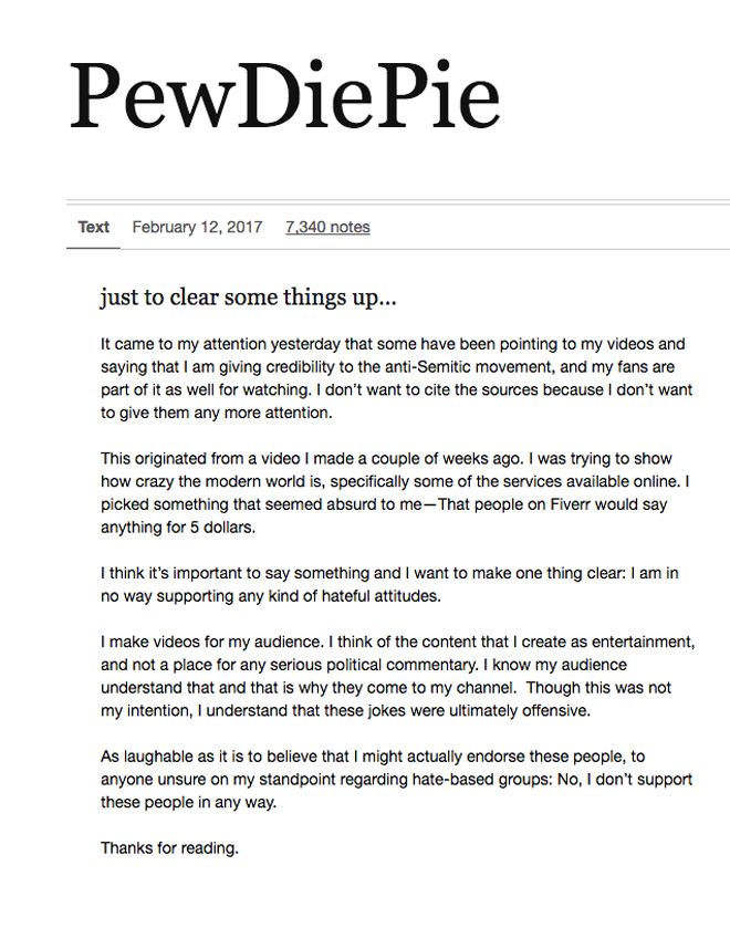 Bu noktada PewDiePie Neo-Nazi sitelerinin kendine destek verdiğini öğrenince 12 Şubat‘ta kendi Tumblr hesabı üzerinden bir açıklama yapıyor ve hiçbir şekilde bu tarz bir desteğinin olmadığını açıklıyor. Burada 12 Şubat tarihi oldukça önemli. Bu açıklama tabii pek ilgi görmüyor. Çünkü haber değeri taşımıyor.