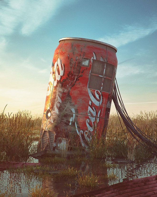 Yıkık dökük bir fabrika şeklindeki GameBoy, grafitilerle bezenmiş eski bir PacMan, suya zorunlu iniş yapmış Mario mantarı ve hatta uzay istasyonu görevi gören ilk PlayStation’a kadar uzanan listede her bir figür devasa boyutlarıyla dünyaya adapte olmuş. McDonald’s çocuk menüsü, kutu Coca Cola şişesi, LEGO parçaları da post apokaliptik evrenin bir parçası haline gelmiş. Praglı sanatçının diğer çalışmalarına Behance hesabından erişebilir, Instagram hesabını buradan takip edebilirsiniz. Hodas’ın pop ikonları üzerine yaptığı çalışmayı haberin devamındaki galeriden görüntüleyebilirsiniz.