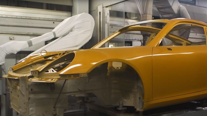Yaklaşık kırk dakikayla bu zamana kadar paylaşılmış en detaylı üretim süreçlerinden birisi olarak karşımıza çıkan videonun başlangıcı 911 Turbo S Exclusive Serisi’nin gövde boyamasıyla başlıyor. Tanıtımıyla birlikte kendisin gösteren özel bir altın sarısına sahip olan araç, boyama sürecini sarı renk üstüne siyah olarak tercih edilen yarış şeritleriyle tamamlıyor. Kullanıcıların isteğine göre oldukça zengin kişiselleştirme seçeneğine sahip olan seride jant seçimlerinin yapılmasının ardından lastikle birlikte iskeletin oluşumu tamamlanıyor. Bolca karbon detayları barındıran konsol, diğer yanal parçalar ve motor entegrasyonunun ardından yola çıkmaya hazır hale gelen Turbo S Exclusive Serisi şanslı 500 sahibinden birine teslim edilmek üzere tamamlanıyor.