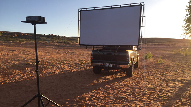 Joe Livingston isimli girişimci tarafından geliştirilen Hitch Theater, dev sinema perdesi ve projektör yoluyla kendi açık hava sinemanızı oluşturmanızı sağlıyor. Fotoğraflarda genellikle kasalı otomobillerle gösterilse de bağlantı aparatları sayesinde düzenek herhangi bir araca, hatta zemine dahi kurulabiliyor.