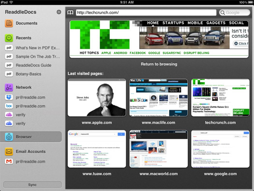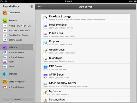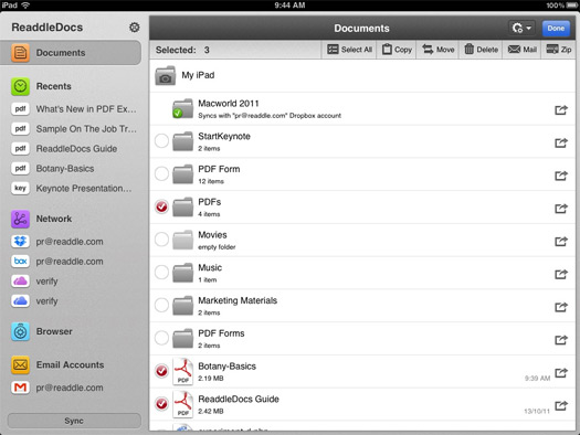 Dropbox, iDisk ve Google Docs eşleme özelliği sunan uygulama birden fazla hesabı da sorunsuzca eşitleyebiliyor. iTunes üzerinden cihaza doküman aktararak yüklü PDF dosyalarını da kolayca görüntüleyebiliyor. Bunlara ek olarak sıkıştırılmış ZIP dosyalarını açabilme ve PDF dokümanlarından metin kopyalama gibi ek özelliklere sahip. Eğer dijital dokümanlarla fazlaca haşır neşir iseniz ReaddleDocs uygulaması işinizi oldukça kolaylaştıracak.