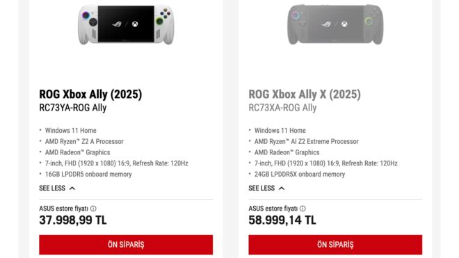 16 Ekim tarihinde satışa sunulacak el konsollarından ROG Xbox Ally için 38 bin TL, ROG Xbox Ally X içinse 59 bin TL Türkiye ön sipariş fiyatı açıklandı. Microsoft ve Asus tarafından ortaklaşa geliştirilen cihazlardan beyaz renkli Ally doğrudan 720p, siyah renkli Ally X ise 900p ile 1080p arası çözünürlükte oyun deneyimine odaklanıyor. Tasarımsal olarak büyük bir sürpriz ortaya koymaya taşınabilir oyun cihazları, Asus ROG Ally ve ROG Ally X ile benzer şekilde 7 inç boyutunda 1080p çözünürlüklü ekranı temel alıyor. 120 Hz yenileme hızına sahip bu ekranda VRR desteği bulunuyor. 60 Wh batarya ile donatılan Ally, AMD Ryzen Z2 A işlemci, 16 GB LPDDR5-6400 RAM ve 512 GB M.2 2280 SSD depolama ile geliyor. 80 Wh bataryanını kullanıldığı Ally X ise gücünü AMD’nin Ryzen AI Z2 Extreme işlemcisinden ve 24 GB LPDDR5X-8000 RAM’den alıyor. Bu cihazda 1 TB M.2 2280 SSD depolama alanı sunuluyor. Temelinde büyük oranda sadeleştirilmiş Windows 11 işletim sistemi bulunan ve Microsoft tarafından özelleştirilen özel bir Xbox arayüzüyle gelen cihazlar, tüm oyunları “Xbox PC” uygulamasında bir araya getiriyor. Burada Steam ve Epic Games Store üzerinden alınan tüm oyunlar listeleniyor.