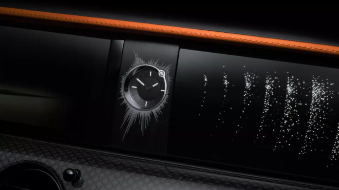 Rolls-Royce Black Badge Ghost Ekleipsis’in aydınlatılmış ön paneli, tam tutulmanın sembolik zaman çizelgesinde lazerle kazınmış 1.846 yıldızla süslenmiş, 100 saatten fazla süren hassas ve titiz bir süreç içerisinde tamamlanmış. Kompozisyon, parlak kesim 0,5 karatlık bir pırlanta içeren bespoke bir saatle doruğa ulaşıyor.