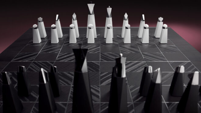 Her bir satranç taşı, çok yüzeyli bir yapıyla hassas bir şekilde üretilmiş olup, kendi başlarına heykelsi bir objeye dönüştü. Tasarımcılar satranç taşlarını tasarlamak için geleneksel satranç figürlerini incelediler ve bunları kare tabanlar halinde aşağı doğru genişletmeyi tercih ettiler. Heykelsi taşların her biri, seramik kaplamalı alüminyumdan üretilmiş olup, içerisinde gizli bir mıknatıs barındırıyor ve mücevheri andıran, parlak, paslanmaz çelik bir başlıkla taçlanıyor. Taşların ağırlığı, sağlamlığı ve dokunulduğunda hissedilen serinlik, Rolls-Royce araçlarında bulunan masif metal org düğmelerini bilinçli olarak çağrıştırıyor. Siyah satranç taşları saten bir yüzeyle tamamlanırken, beyaz taşlar zarif ışıltılı bir görünüme sahip.