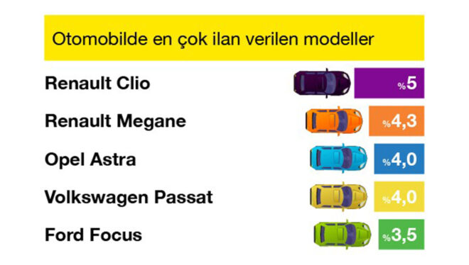 Rapora göre ayın en çok ilan verilen kategorisi otomobil oldu. Sıralama; Minivan & Panelvan, Motosiklet, Arazi/ SUV & Pick-up ve Ticari Araçlar kategorisi ile devam etti. Marka & Model sıralamasının lideri Renault – Clio oldu. Sıralama; Renault – Megane, Opel – Astra, Volkswagen Passat ve Ford Focus ile devam etti. Arazi/ SUV & Pick-up kategorisinin marka sıralaması ise Nissan, Volkswagen, Land Rover, Peugeot ve Dacia oldu.