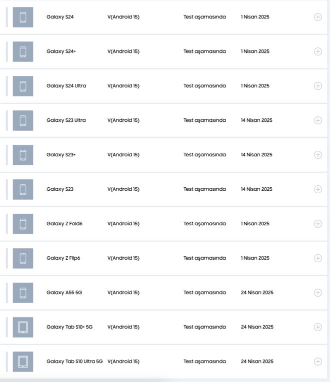 Samsung’un resmi internet sitesine göre Türkiye’de Android 15 tabanlı One UI 7’ye nisan-mayıs döneminde geçirilecek (bazı cihazlar için dağıtım mayıs ayına sarkabilir) ilk cihazlar, “Galaxy S24, Galaxy S24 Plus, Galaxy S24 Ultra, Galaxy S23, Galaxy S23 Plus, Galaxy S23 Ultra, Galaxy Z Fold6, Galaxy Z Flip6, Galaxy A55 5G, Galaxy Tab S10 Plus 5G ve Galaxy Tab S10 Ultra 5G” olacak. Aşağıdaki resmi listeye ilerleyen dönemde başka akıllı telefon ve tablet modelleri de eklenecek.