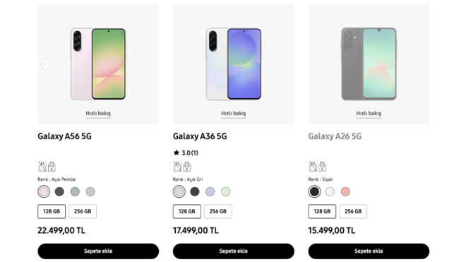 15.499 TL satış fiyatı, Samsung Galaxy A26 modelinin 128 GB depolamalı sürümü için açıklandı. Cihazın 256 GB depolamalı sürümü 16.499 TL’den satın alınabiliyor. Geçtiğimiz hafta satışa sunulan Samsung Galaxy A36 için 8 GB RAM + 256 GB depolama özelinde 17.499 TL, daha üstte yer alan Galaxy A56 içinse 8 GB RAM + 256 GB depolama özelinde 22.499 TL resmi satış fiyatı açıklanıyor. 5G destekli telefonlar ortak olarak 6,7 inç boyutunda, 120 Hz yenileme hızına sahip AMOLED ekranlara yer veriliyor. Telefonlarda yine ortak olarak 5.000 mAh batarya kullanılıyor ve OIS destekli, f/1.8 diyafram açıklığına sahip 50 megapiksellik geniş açılı ana kamera bulunuyor. Galaxy A26’nın arkasına 50 megapiksel ana kameraya ek olarak 8 megapiksel ultra geniş açı ve 2 megapiksel makro kameralarını konumlandıran şirket, Galaxy A36’da ana kameraya ek olarak 8 megapiksel ultra geniş açı ve 5 megapiksel makro, Galaxy A56’da ise ana kameraya ek olarak 12 megapiksel ultra geniş açı ve 5 megapiksel makro kameraları kullanıyor. Bluetooth 5.3 destekli modeller, kutularından Android 15 tabanlı One UI 7 ile çıkıyor ve 6 yıl güncelleme sözüyle geliyor. IP67 sertifikasına sahip cihazlardan Galaxy A56’da Exynos 1580 işlemci kullanılıyor. Galaxy A26 modelinde Exynos 1380, Galaxy A36’da ise Snapdragon 6 Gen 3’e yer veriliyor. Galaxy A56 ve Galaxy A36’da 45W, Galaxy A26’da ise 25W şarj desteği sunuluyor.