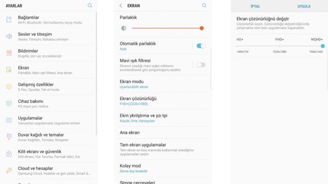 Galaxy Note 8, Super AMOLED ekranında WHQHD+ çözünürlük sunuyor. Canlı ve gerçekçi renklerle etkileyici bir performans sunan ekran kutudan çıktığında ise otomatik olarak FHD+ çözünürlükle geliyor. Ekrandan tam performans almak için çözünürlüğü yükseltmeniz gerekiyor. Bunun için Ayarlar > Ekran > Ekran çözünürlüğü kısmında çözünürlüğü WQHD+’a çekebilirsiniz. Ancak bu seçimin kullanım süresini etkileyeceğini de eklemeden geçmeyelim.