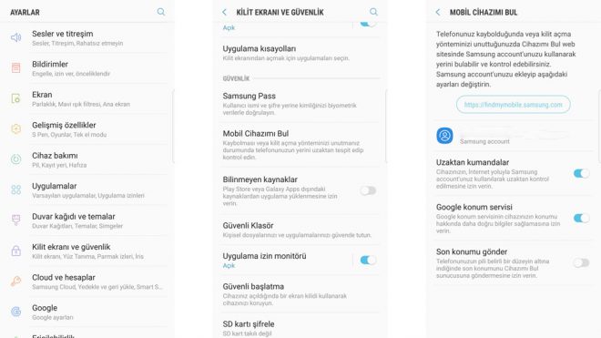 Galaxy Note 8’i kaybolma ya da çalınma durumunda basit bir özellikle rahatlıkla bulabilirsiniz. Ayarlar > Kilit ekranı ve güvenlik > Mobil cihazımı bul seçeneğine giderek buradaki ayarlamaları açarsanız cihazınız kaybolduğunda ya da çalındığında Samsung hesabınızı kullanarak cihazı uzaktan kontrol edebilir, konumunu görüntüleyebilir, hatta pil belirli bir düzeyin altına indiğinde son konumu göndermesini sağlayabilirsiniz.