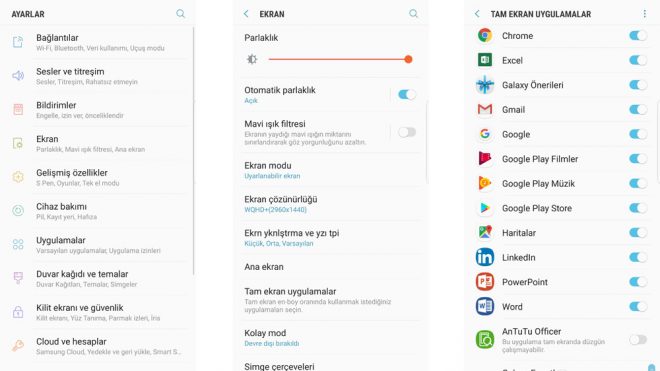 Galaxy Note 8, 6,3 inç boyutunda devasa bir ekranla geliyor. WQHD+ çözünürlük sunan ekranın oranı ise 18,5:9. Ancak tüm uygulamalar ne yazık ki bu ekran oranına uygun gelmeyebiliyor. Ancak cihaz bunu düzenlemek için bir opsiyon sunuyor. İndirdiğiniz uygulamanın 18,5:9 oranında görüntülenmesini istiyorsanız Ayarlar > Ekran > Tam ekran uygulamalar kısmına gelerek burada tam ekran en-boy oranında kullanmak istediğiniz uygulamaları seçebiliyorsunuz.