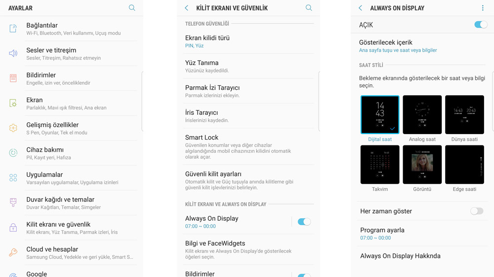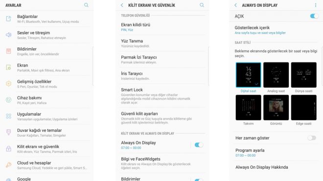 Ancak tema içinde de bazı şeyleri ayrıca kişiselleştirmek mümkün. Mesela Always On Display’in görünümünü değiştirebilirsiniz. Ayarlar > Kilit ekranı ve güvenlik > Always On Display seçeneğine girdiğinizde karşınıza 6 farklı seçenek çıkıyor. Buradan her zaman açık ekranınızı en ideal şekilde düzenlemeniz mümkün.