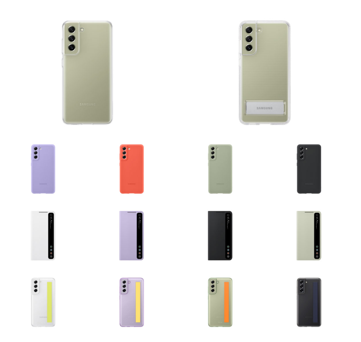 Samsung Galaxy S21 FE, 3 Ocak tarihinde aşağıdaki teknik özellikler ile lanse edilecek. Çıkışı uzun zamandır beklenen telefon, Samsung’un resmi sitede yaptığı hata üzerinden öğrenildiği üzere 15 farklı kılıfa (Tüm renkler ile) sahip olacak. Bu resmi kılıfların 5 farklı tipte olduğu aktarılıyor ve örnekler yukarıda ve sayfanın altında yer alıyor. Burada böyle bir cihaz için normal olduğu üzere büyük bir sürpriz bulunmuyor.