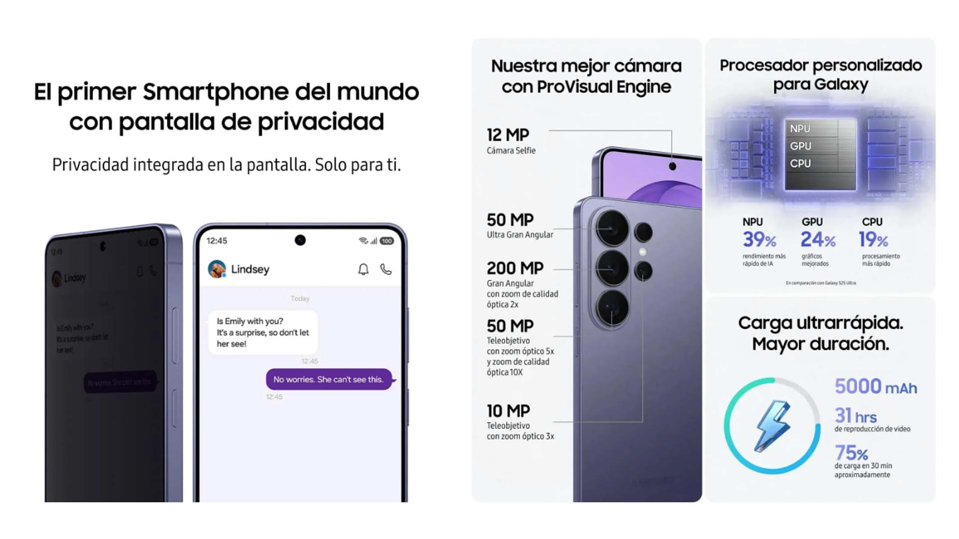 Ortada yer alan Galaxy S26 Plus, 6,7 inç boyutunda 120 Hz’lik 3120 x 1440 piksel Dynamic AMOLED 2X ekran, pazarına göre Exynos 2600 ya da Snapdragon 8 Elite Gen 5 işlemci, 12 GB RAM, 256/512GB depolama, 45W şarj destekli 4.900 mAh batarya ve 12 megapiksel (f/2.2, 13mm, 120 ̊, 1/2.55″, 1.4μm) selfie kamerasıyla geliyor. Telefonun arkasında ise 50 megapiksellik geniş açı (f/1.8, 24mm, 1/1.56″, 1.0μm, dual pixel PDAF, OIS), 10 megapiksel 3x telefoto (f/2.4, 67mm, 1/3.94″, 1.0μm, PDAF, OIS) ve 12 megapiksel ultra geniş açı (f/2.2, 13mm, 120 ̊, 1/2.55″ 1.4μm) kameralar bir araya getiriliyor. 190 gramlık telefonun gövde boyutu 158.4 x 75.8 x 7.3mm olarak açıklanıyor.