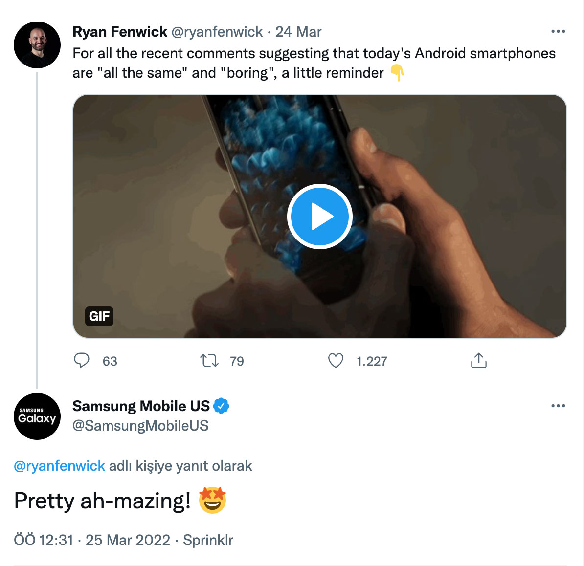Samsung Mobile’ın ABD Twitter hesabı, kısa süre önce OPPO ve OnePlus PR uzmanının Twitter’dan yaptığı OPPO Find N paylaşımının altına “Oldukça Muhteşem” tarzında bir yorum attı. Bu yorum elbette kişilerin dikkatinden kaçmadı ve bir anda birçok farklı sosyal medya kanalında gündem oldu. Peki bunun arkasında ne yer alıyor? Samsung neden rakibinin telefonunu öne çıkarıyor? Burada ilk akla gelen, Samsung Mobile’ın Twitter hesabını yöneten kişilerin paylaşılan katlanabilir telefon modelini Galaxy Z Fold zannetmesi. Yani ortada çok yüksek ihtimalle bir yanlış anlaşılma ya da hata bulunuyor. Firmanın kasıtlı olarak rakibini öne çıkarmak adına bir paylaşımda bulunması çok olası durmuyor.
