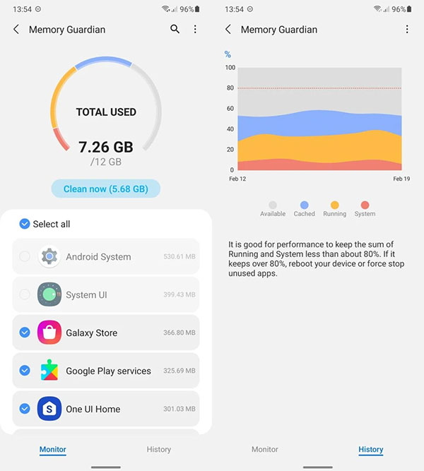 Direkt olarak APK olarak buradan ve buradan elde edebileceğiniz Samsung imzalı Memory Guardian ve Thermal Guardian, Galaxy telefon sahiplerine sunulan iki yeni faydalı uygulama. Baktığımız zaman Memory Guardian direkt olarak olarak bellek yönetimine odaklanıyor. Uygulamada cihazın RAM kullanımı grafiksel olarak gösteriliyor ve tek tek yüksek RAM kullanan uygulamalar tespit edilerek kolaylıkla kapatılabiliyor. Burada tek tuşla RAM boşaltma özelliği de sunuluyor. Yeni uygulamalardan bizce en çok Thermal Guardian dikkat çekiyor.
