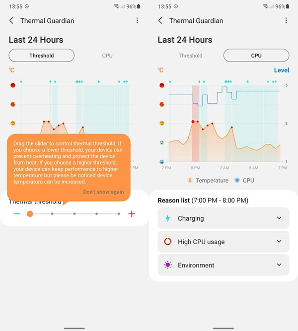 Thermal Guardian uygulaması kişilerin işlemci kullanım geçmişlerini ve işlemci sıcaklığını görmesini / takip etmesini mümkün kılıyor. Memory Guardian ile benzer olarak modern bir arayüzü bulunan uygulama, burada kullanıcılara önemli bir seçenek de sunuyor. Bu seçenek tam olarak “termal eşik seviyesi” olarak geçiyor. Termal eşik düşük ayarlandığı zaman telefon daha az ısınıyor ancak bunun için performans kesiliyor. Termal eşik yüksek ayarlandığı zaman ise telefon daha çok ısınıyor ancak performans devamlı olarak yüksek kalıyor. Firma istenirse bu konuda orta karar bir ayar seçilmesine de imkan tanıyor.
