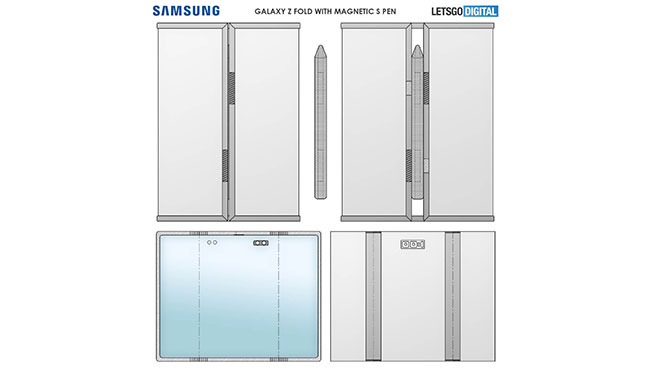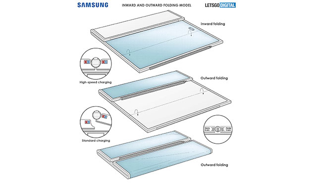 Bu model için oldukça detaylı patentler alan Samsung, temelde yine iki noktadan katlanan ekrana sahip bir modeli karşımıza getiriyor.