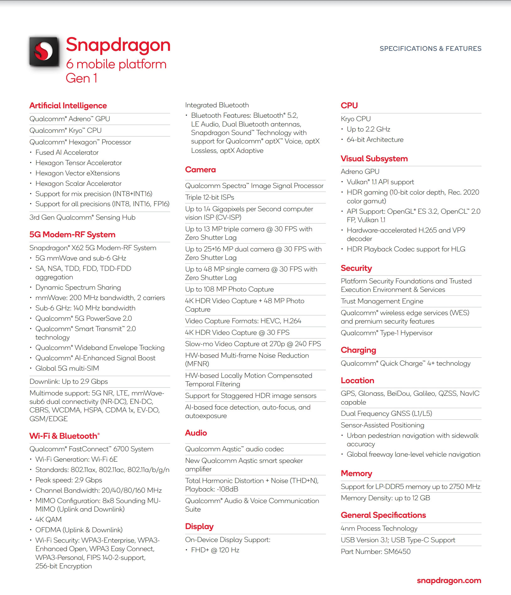 5G bağlantı getiren Snapdragon X62 modem ile donatılan mobil işlemci Snapdragon 6 Gen 1, Bluetooth 5.2, Wi-Fi 6E, FHD+ çözünürlükteki ekranlar için 120 Hz yenileme hızı ve yüksek hızlı şarj getiren Quick Charge 4 Plus desteklerini de beraberinde getiriyor. Adı verilmeyen bir Adreno GPU birimi üzerine kurulan işlemcinin çekirdek bazlı kurulumu henüz detaylanmış değil. Sadece Kryo CPU çekirdeklerinin bu işlemci özelinde 2.2 GHz hıza kadar ulaşabileceği aktarılıyor.