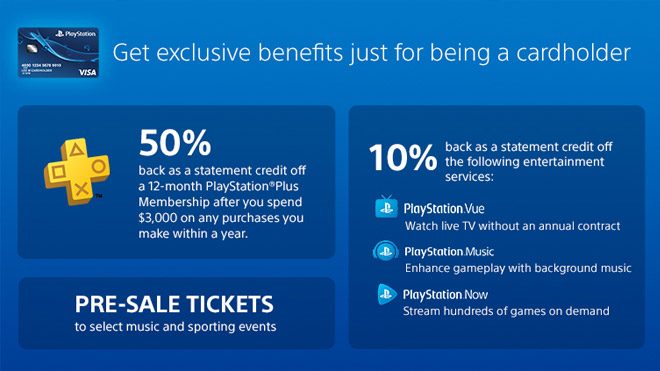 Sony’nin oyuncular için tasarlanmış PlayStation kredi kartı oyuncular için çeşitli avantajlar sunuyor. Sıradan bir kredi kartı gibi kullanılabilen PlayStation kartıyla yapılan ilk alışverişin ardından 50 dolarlık PlayStation mağaza kodu kartınıza tanımlanıyor. Kartı kullandıkça puanlar elde ediyorsunuz. Standart alışverişler normal puanlama yansıtılırken PlayStation mağazasından yaptığınız alışverişlerden elde edilecek puanlar 5’le çarpılıyor. PlayStation ve Sony ürünleri için de aynı şey söz konusu. Mobil hattınızın faturasını ödediğinizde ise elde ettiğiniz puan 3’le çarpılıyor.