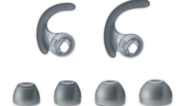 Kulaklık 2 ayrı boy yay şeklinde destek ve 4 ayrı boy uzun hibrit silikon kauçukla geliyor