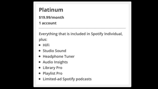Rakiplerinden farklı olarak yüksek kaliteli müzik keyfini daha yüksek bir bedel ile satacak gibi görünen Spotify, bahsi geçen Platinum pakete “ne olduğu henüz bilinmeyen Studio Sound, özel kulaklık ayarları, Pro kütüphane, Pro çalma listesi ve özel podcast bölümleri” gibi bazı ekstralar da koyma konusunda planlar gerçekleştiriyor. Ancak bunların henüz tam olarak netleştirilmediği belirtiliyor.