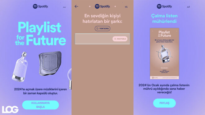 “Playlist for the Future” ya da “Playlist in a bottle” mottoları ile öne çıkarılan yeni Spotify özelliği, şirket tarafından Türkçe olarak şöyle açıklanıyor: “Gelecekteki haline müziklerini içeren bir zaman kapsülü gönder. 2024’te açmak üzere müziklerini içeren bir zaman kapsülü oluştur.” Bu özellik kapsamında buradaki bağlantıyı kullanarak (Mobilde) kendi zaman kapsülünüzü oluşturabilirsiniz. Bu süreçte şirket sizden en sevdiğin kişiyi hatırlatan bir şarkı, 2023’te canlı dinlemen gereken bir şarkı, bir yıl sonra hiçbir anlam ifade etmeyecek bir şarkı, önümüzdeki yıl klasik olacak bir şarkı gibi sorulara müzik belirleyerek cevap vermenizi istiyor. Zaman kapsülünüzü neye koyacağınızı dahi soran Spotify, altyapı için çok sayıda soru üretmiş ve bir yıl sonra dinleyeceğiniz çalma listenizi arkadaşlarınız ile paylaşmanıza da imkân tanıyor.