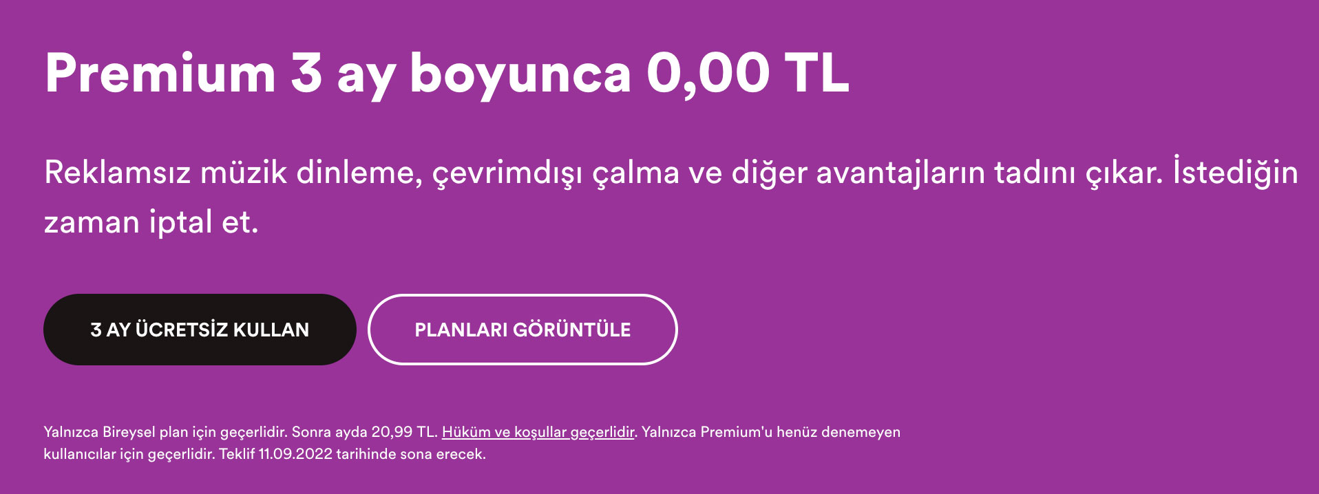 Geçtiğimiz günlerde detaylarına burada yer verdiğimiz Türkiye abonelik fiyat artışı ile ses getiren Spotify, ondan önce de detaylarına burada yer verdiğimiz Android tarafındaki tasarım değişikliği ile ses getirmişti. Firma en son ise detaylarına burada yer verdiğimiz konser bilet satışı ile gündeme gelmişti. Şimdi ise Türkiye merkezli bir adım atıldı. Bugün resmi abonelik sayfasında güncellemeye giden şirket, bir kez daha ilk defa Premium abone olacaklardan 3 ay ücret almayacağını duyurdu. Yani ücretsiz deneme süresini 1 aydan 3 aya çıkaran firma, bu sayede daha fazla kullanıcı çekmek istiyor ve bunda başarılı olacak gibi görünüyor. Spotify’ın bireysel olarak en düşük fiyatı 20,99 TL seviyesinde yer alıyor. Öğrenci ise 10,49 TL seviyesinde.