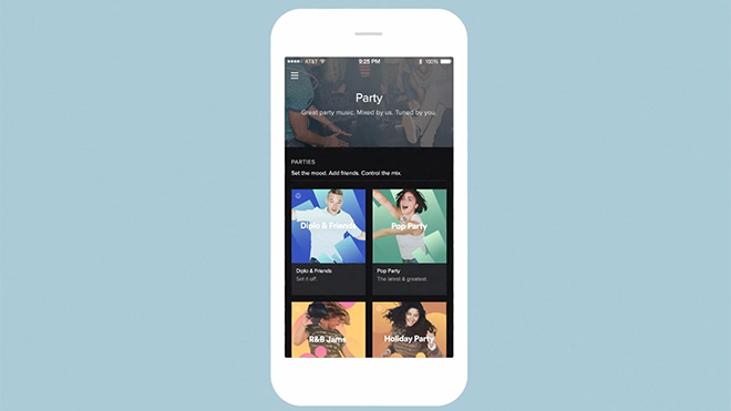 Halihazırdaki Party kategorisi altında bulunan çalma listelerinden farklı olarak, yeni özellikle birlikte daha akışkan ve kesintisiz müzik deneyimi vadediliyor. Şarkıları ritimlerine göre otomatik olarak eşleştiren Spotify Party, parça geçişlerinde parçaları adeta birbirine kaynaştırıyor. Ünlü DJ Diplo eşliğinde hazırlanan hazırlanan listeler, adeta o an canlı bir DJ tarafından çalınıyormuş hissi veriyor.