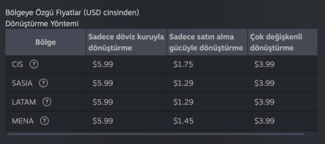 Steam, fiyat dönüştürme verilerini dünya genelindeki güncel pazar koşullarını daha iyi yansıtacak şekilde güncellediklerini duyurdu. Bu konuda yaptığı açıklamada “Veriler güncellendi ve iki yeni dönüştürme yöntemi eklendi” diyen şirket, satın alma gücüne bağlı fiyatlandırma sistemi için ek olarak şunları söyledi: “Steam, oyununuzu dünya çapındaki müşterilere satabilmeniz için 35 farklı para biriminde ve 4 farklı bölge grubunda fiyatlandırmayı destekler. Her zaman olduğu gibi, oyun fiyatınızı belirlemek tamamen sizin tasarrufunuzdadır. Birçok geliştiricinin tüm bu para birimlerine ve her birinin kaç haneli olması gerektiğine hakim olmadığını biliyoruz ve sunduğumuz bu araçların size dünya çapındaki çeşitli pazarların beklentilerine uygun fiyatlar belirlemede yardımcı olacağını düşünüyoruz. Piyasa koşulları zamanla değiştiğinden, geliştiricilerin Steam’deki ürünlerini uygun fiyatlarda tutmasına yardımcı olmak için fiyatlandırma verileri de aralıklarla güncellenmektedir. Yeni değerler ve bazı ilave seçenekler bugün yayınlandı. Bunların detaylarını aşağıda bulabilirsiniz.” ifadelerini kullanan şirket, geliştiricilere artık üç farklı dönüştürme yöntemi sunuyor. Bu konuda şunlar aktarılıyor: