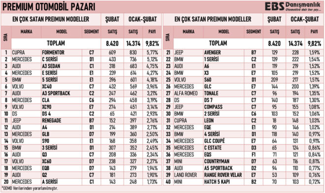 Emre Özpeynirci tarafından burada yapılan paylaşıma göre 2024’ün ikinci ayında da Türkiye’de en çok satılan sıfır premium yani üst sınıf otomobil modeli Cupra Formentor oldu. Şubat ayında 609 adet satılan aracı, şubat ayında 433 adet satılan Mercedes-Benz C serisi takip etti, üçüncü araç ise 318 satış ile Audi A3 Sedan oldu. Listenin devamında Mercedes-Benz E serisi, BMW 5 serisi, Volvo XC40, Audi A3 Sportback, Mercedes-Benz CLA, Volvo XC90, DS DS4, Jeep Renegade, Audi A4, Mercedes-Benz GLB, Volvo S90, BMW 3 serisi, Audi Q3, Volvo XC60, Mercedes-Benz EQB ve Audi Q2 gibi araçlar sıralandı. Premium markalar özelinde ocak ve şubat aylarının satış lideri toplam 3.853 satış ile Mercedes-Benz olurken, Mercedes’i diğer Alman markalar BMW ve Audi izledi. Aktarıldığı kadarıyla iki ayda 5 Lamborghini, 3 Ferrari ve 3 Bentley satıldı, aynı zamanda 171 Porsche, 35 Maserati, 4 Aston Martin de yeni sahiplerine teslim edildi.
