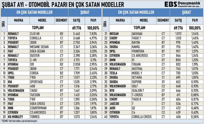 Otomobil gazetecisi Emre Özpeynirci tarafından yapılan paylaşıma göre şubat ayında en çok satılan sıfır otomobil modelleri şunlar oldu: