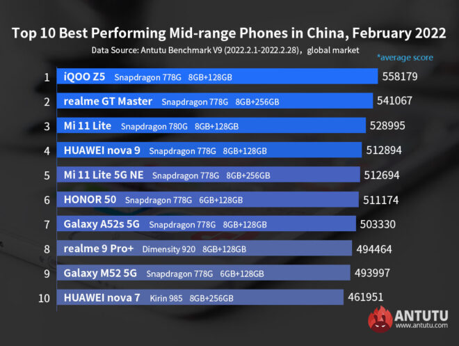 Bu tarafta lider iki aydır değişmiyor ve yine Snapdragon 778G işlemcili iQOO Z5 oluyor. Bu listenin büyük çoğunluğu halen gücünü Snapdragon 778G’den alıyor. İlk 10 içerisinde farklı olarak sadece 778G Plus, Kirin 985 ve MediaTek Dimensity 900 karşımıza çıkıyor.