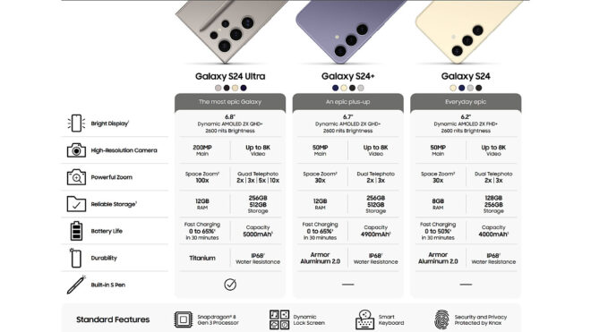 Galaxy S24: “6,2-inç FHD+ 120 Hz 2.600 nit Dynamic AMOLED 2X ekran, 8 GB RAM, 128/256 GB depolama, Bluetooth 5.3 desteği, Wi-Fi 6E desteği, yüzde 50 doluluğa 30 dakikada ulaşan 4.000 mAh pil, 12 megapiksel selfie kamerası, üçlü arka kamera sistemi (12 megapiksel ultra geniş açı + 50 megapiksel geniş açı + 10 megapiksel 2x-3x telefoto), 30x Space Zoom, 8K video yeteneği, IP68 sertifikası, Armor Aluminum 2.0 gövde.”