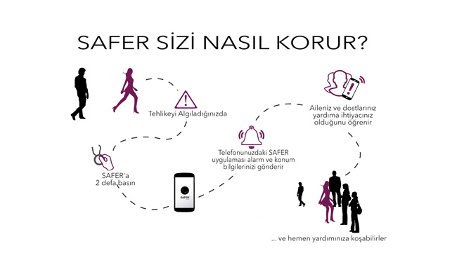 Daha önce internet sitemizde yer verdiğimiz kendinizi güvende hissetmediğiniz anda yakınlarınıza mesaj göndermeye yarayan Athena gibi Safer da aynı prensipler üzerine kurulu. iOS ve Android işletim sistemli akıllı telefonlara Bluetooth üzerinden bağlanan kolyeye kendinizi tehlikede hissettiğiniz an iki kere basarak o anki konumunuzu ve tehlikede olduğunuz bilgisini daha önceden uygulamasında kaydettiğiniz kişilere bildirim olarak iletebilirsiniz. Kolyeye basıldığı anda SMS, e-posta ve uygulama bildirimi kayıtlı kişilere iletiliyor. Mesajı aldıktan sonra Safer uygulamasını açan kullanıcılar o anki konumunuzu harita üzerinden görebiliyor.