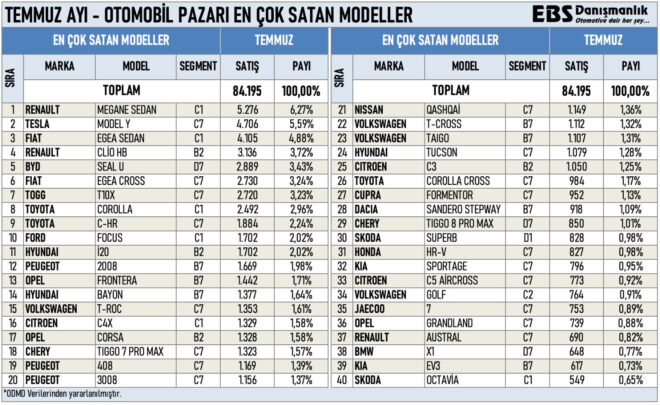 Otomotiv Distribütörleri ve Mobilite Derneği verileri üzerinden temmuz ayında Türkiye’de en çok satılan sıfır otomobil modelleri listelendi.
