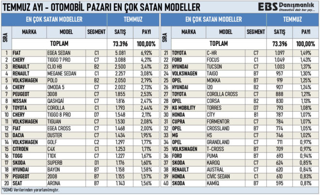 Otomotiv Distribütörleri ve Mobilite Derneği verileri üzerinden temmuz ayında Türkiye’de en çok satılan sıfır otomobil modelleri listelendi.