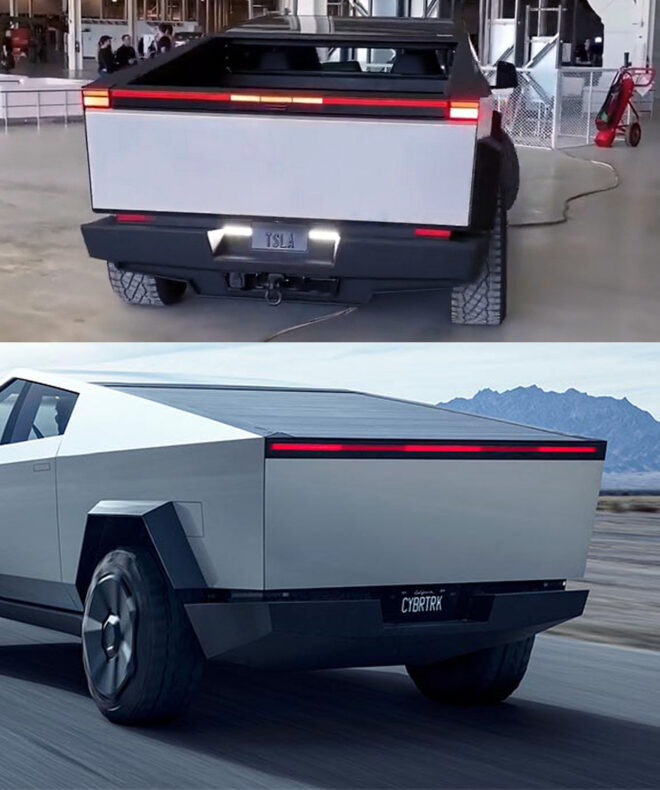 En son prototip versiyonun arkasında orijinal sürümden daha farklı bir LED stop takımına geçildiği görülüyor. Artık daha parçalı ve iki katlı bir aydınlatma kullanılıyor. Geri vites ışıkları plakanın yanına konumlandırılan Tesla Cybertruck, videosu paylaşılan versiyonda açıkta duran bir çeki demiri taşıyor. Bunun piyasaya çıkan sürümde de böyle olup olmayacağı henüz tam olarak bilinmiyor.