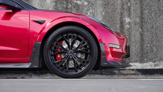 Geliştirme kapsamında yapılanla arasında; genişletilmiş marşpiyeller, arka tampon dişleri, kevlar ile güçlendirilmiş karbon fiber paneller ve karbon fiber kaput gibi dinamikler karşımıza çıkıyor. Marka tarafından yapılan açıklamaya göre Model 3’ün fabrika çıkış versiyonu malzemeleri yerine kullanılan bu parçalarla birlikte ortaya 20 kilogram daha hafif bir otomobil çıkartılmış durumda. Kit ayrıca arabayı önde 25 milimetre, arkada ise 35 milimetre genişletiyor. Performans bazında herhangi bir dokunuşun yapılmadığı proje, elde edilen ağırlık kazanımı sayesinde bu ihtiyacı ortadan kaldırmış durumda.