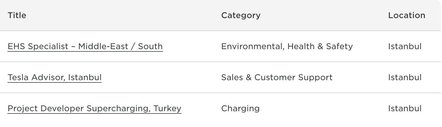 İşte bu operasyon için Tesla, şu an güncel olarak İstanbul merkezli üç farklı iş ilanına sahip. Firma direkt olarak burada ya da aşağıda görebileceğiniz bu üç ilan ile beraber operasyonun kilit aşamalarını doldurmaya çalışıyor. Tamamen İngilizce CV’ler üzerinden başvuru yapılabilen ilanlardan özellikle hızlı şarj ağına özel olan büyük önem arz ediyor.