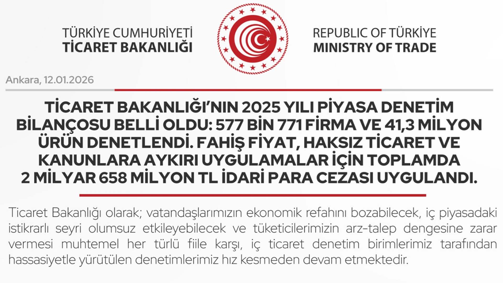 “2025 yılı 1 Ocak – 31 Aralık tarihleri arasında gerçekleştirilen denetimler neticesinde 577 bin 771 firma ile 41.265.285 ürün denetlenmiş, fahiş fiyat, haksız ticaret ve kanunlara aykırı uygulamalar için toplamda 2 milyar 658 milyon TL idari para cezası uygulanmıştır.” açıklamasını yapan Ticaret Bakanlığı, X üzerinde yaptığı son paylaşımda, “2025 yılında gerçekleştirilen otomotiv, stokçuluk, emlak, kuyumculuk, fahiş fiyat, haksız ticari uygulamalar, abone sözleşmeleri ve ödeme süreleri kapsamında yapılan denetimler neticesinde 121.649 gerçek ve tüzel kişi denetlenmiş, aykırı fiillerde bulunan 5.793 gerçek ve tüzel kişiye toplamda 969,8 milyon TL idari para cezası uygulanmıştır. Ticaret Bakanlığı İç Ticaret Genel Müdürlüğümüz tarafından yapılan denetimlerde, haksız ticari uygulama ve ödeme süreleri kapsamında 290,2 milyon TL, fahiş fiyat kapsamında 296 milyon TL, kuyumculuk sektörü denetimlerinde 19,3 milyon TL, emlak sektöründe 91,5 milyon TL, Otomotiv sektöründe ise 200 milyon TL idari para cezası uygulanmıştır. Ticari elektronik ileti ve çalışma saatlerine ilişkin denetimlerde uygulanan idari para cezası miktarı ise 73,6 milyon TL olarak gerçekleşmiştir.