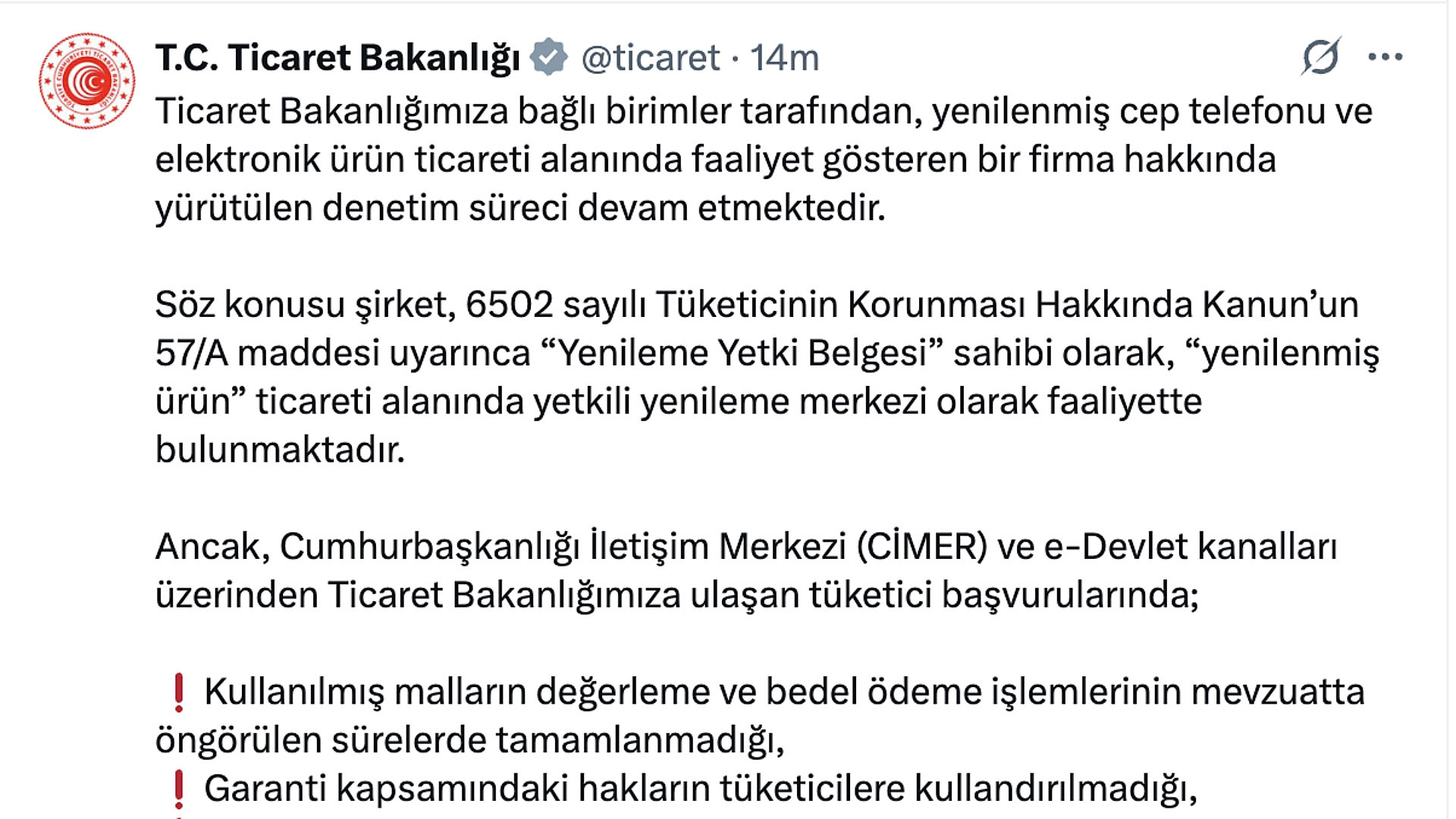 Bu çerçevede, şirket hakkında Ticaret Müfettişlerimizce inceleme ve denetim süreci halihazırda devam etmektedir. Ticaret Bakanlığı olarak; Tüketicilerimizin haklarının korunması, Piyasada güvenli ve şeffaf ticaret ortamının sürdürülmesi, Yenilenmiş ürün sektöründe faaliyet gösteren işletmelerin mevzuata uygun şekilde denetlenmesi hususlarında gerekli tüm adımlar kararlılıkla atılmaktadır. Vatandaşlarımızdan, yenilenmiş ürün alışverişlerinde Yenileme Yetki Belgesi bulunan firmaları tercih etmeleri, olası mağduriyet durumlarında ise Alo 175 Tüketici Danışma Hattı veya CİMER üzerinden başvurularını iletmeleri önemle rica olunur. Kamuoyuna saygıyla duyurulur.”