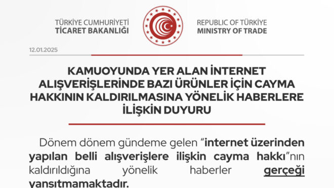 Son açıklamada şunlar aktarıldı: “Dönem dönem gündeme gelen “internet üzerinden yapılan belli alışverişlere ilişkin cayma hakkı”nın kaldırıldığına yönelik haberler gerçeği yansıtmamaktadır. Söz konusu ürünlerde cayma hakkında değişikliğe dair maddelerin uygulanması kararı, 10.08.2024 tarihli Resmi Gazete’de yayınlanan Yönetmeliğe göre, 01.01.2026 tarihine dek ertelenmiştir.” Ticaret Bakanlığı bu konuda daha önce şunları aktarmıştı: “Teknoloji çağının getirdiği yenilikler e-ihracat, e-ithalat gibi sınır ötesi ekonomik ilişkiler de dahil olmak üzere ticaretin yapılış şekilleri ve alışveriş alışkanlıklarında köklü değişiklikleri beraberinde getirmiştir. Elektronik ticaretin çok sayıda ürün çeşidini zaman ve mekan sınırından bağımsız olarak hızlı, kolay ve daha düşük maliyetle tüketicilere sunabilmesi; satıcılar bakımından ise işyeri kira maliyetinin olmaması ayrıca stok ve finansman maliyetlerinin ise daha düşük olması gibi faktörlere bağlı olarak elektronik ticaretin toplam perakende ticaretten aldığı payın her geçen yıl geleneksel ticarete nazaran arttığı gözlemlenmektedir.