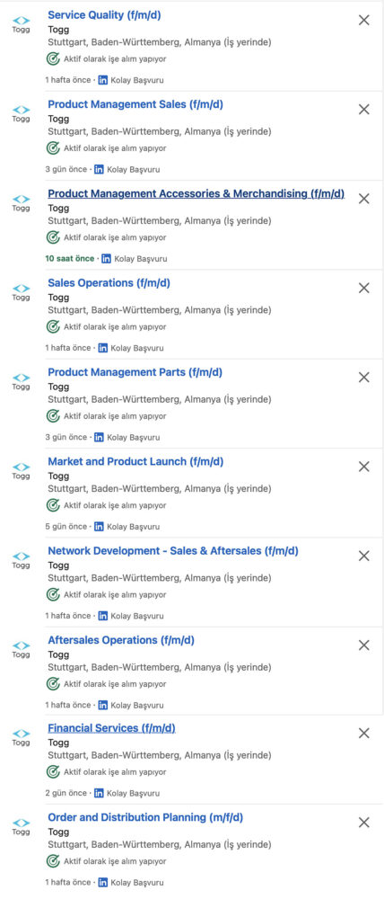 CES 2024 kapsamında Togg CEO’su M. Gürcan Karakaş tarafından da aktarıldığı kadarıyla firma 2024 bitmeden önce Avrupa pazarına giriş yapacak ve burada ana ülke Almanya olacak. İşte bu Almanya merkezli operasyon için yeni iş ilanları açılmaya devam ediliyor. Şu an Almanya için hemen aşağıda ya da buradaki resmi LinkedIn sayfasında görebileceğiniz 10 farkı pozisyonda personel arayan Togg, sürpriz olmayacağı üzere milyonlarca eski Türkiye Cumhuriyeti vatandaşının yaşadığı Avrupa’yı potansiyeli çok yüksek bir pazar olarak görüyor. Şu an satışı yapılan T10X ve 2025 yılında satışa sunulacak T10F ile Avrupa genelinde öne çıkması, son dönemdeki fiyat-performans oranı aşırı yüksek Çinli elektrikli araçlar nedeniyle zor olan Togg, yine de küresel bir marka olmak istiyor ve bu konuda Avrupa kapısının açılacak olması gelecek için çok önemli görünüyor.
