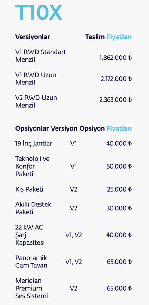 Togg’dan yeni fiyatlarla alakalı olarak yapılan resmi açıklamada şunlara yer verilmişti: “Aralık 2023’ten bu yana fiyatı artmayan Togg T10X, otomobillere yönelik Özel Tüketim Vergisi’nde (ÖTV) yapılan düzenleme sonrası yeni fiyatıyla satışa sunuluyor. Buna göre T10X V1 standart menzil 1.862.000 TL, V1 uzun menzil 2.172.000 TL ve V2 uzun menzil 2.363.000 TL başlangıç fiyatıyla kullanıcılarla buluşuyor.” Zamlı fiyatlarla birlikte T10X’in üst fiyatı artık 3 milyon TL’yi geçiyor. T10X V2 RWD Uzun Menzil, eğer şirket tarafından resmi olarak sunulan tüm opsiyonlarla birlikte tercih edilirse 3 milyon 168 bin TL’ye kadar çıkıyor. Orta paket 2 milyon 367 bin TL’ye, alt paket ise opsiyonlar sonrasında 2 milyon 17 bin TL’ye ulaşıyor.
