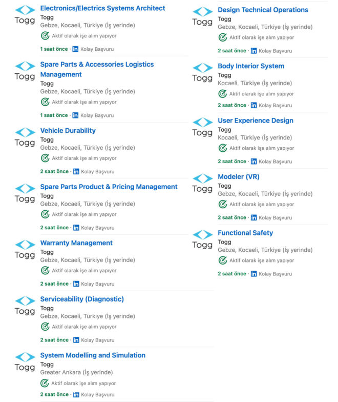 Yerli otomobil projesinin arkasında yer alan Togg, birçok farklı alanda ve bölgede işe alımlar yapmayı aktif olarak sürdürüyor.