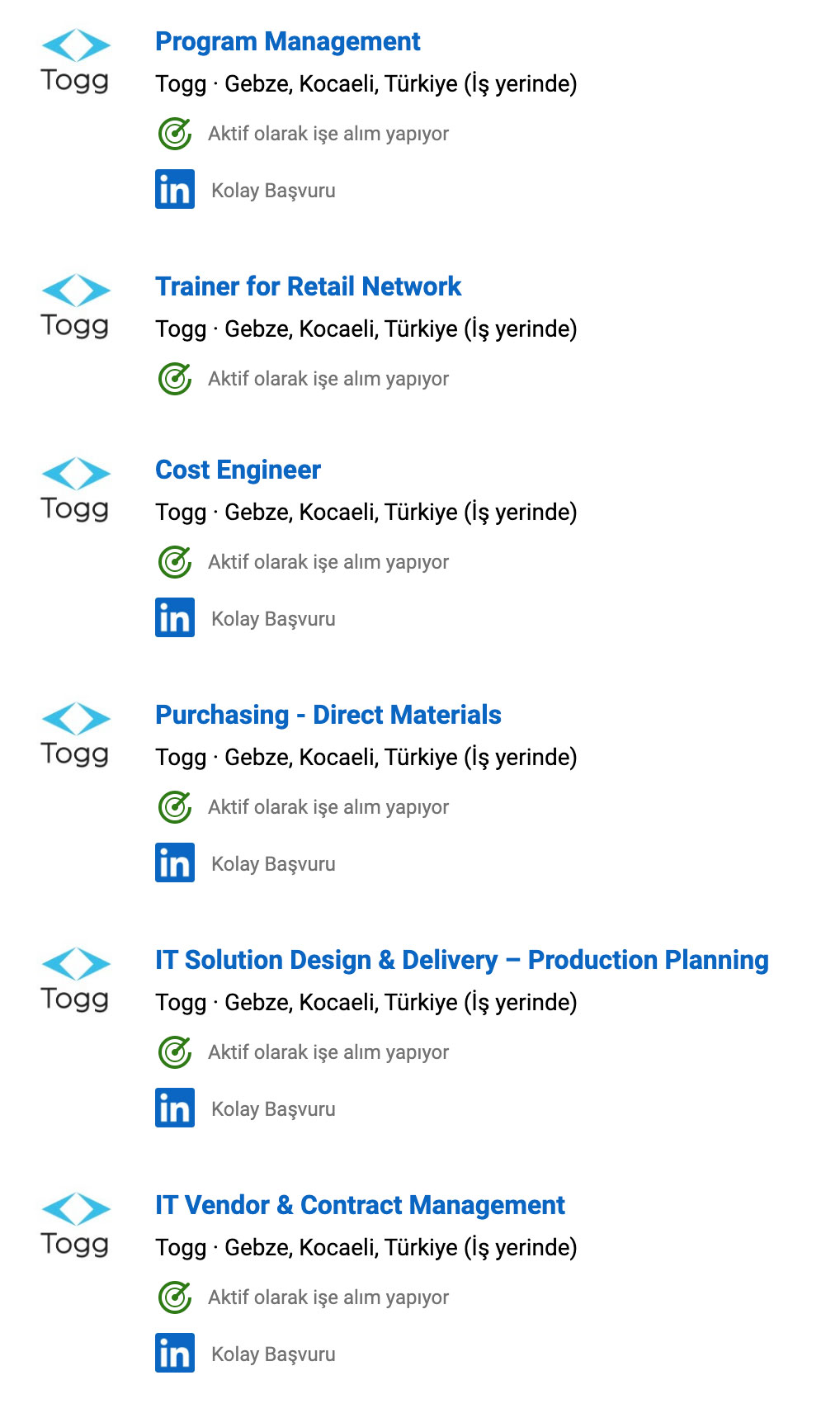 Yerli otomobil projesinin arkasında yer alan Togg, birçok farklı alanda ve bölgede işe alımlar yapmayı aktif olarak sürdürüyor.